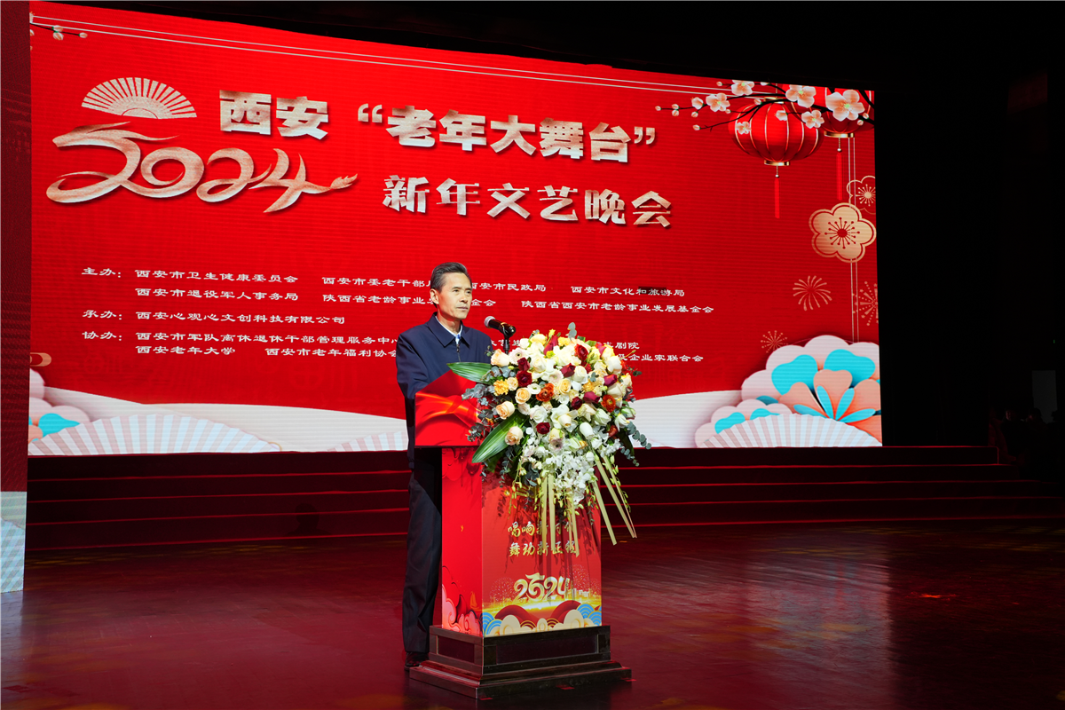 中共西安市委常委、副市长、市老龄委主任杨建强代表市委、市政府,向参加晚会的嘉宾和艺术家表示欢迎,向关心和支持西安老龄工作的社会各界人士表示感谢,向全市的老年朋友致以新年的祝福!