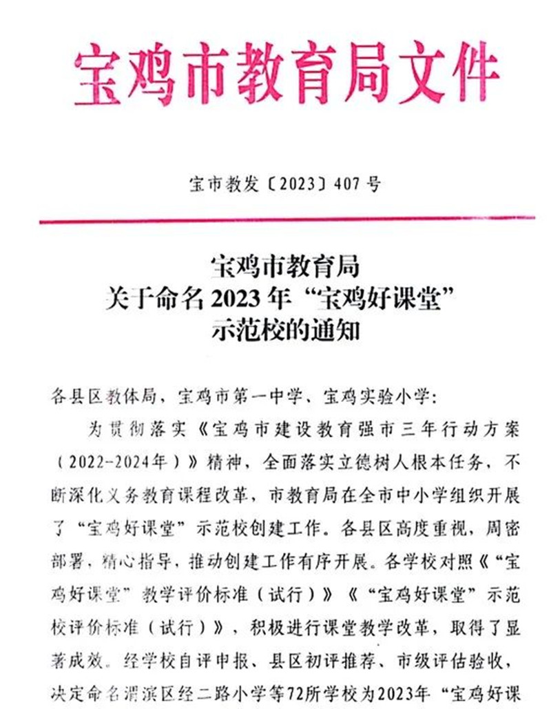 岁末获喜讯,佳绩贺新年。近日,宝鸡高新小学被宝鸡市教育局命名为2023年首批“宝鸡好课堂”示范校,学校获此殊荣,为新的一年鼓舞了士气,增添了喜气。
