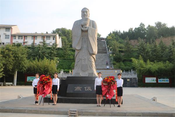 首先,教师代表向先贤燕伋像敬献花篮,学校党支部副书记、校长兰晓利整理绶带,并带领全体师生向燕伋像三鞠躬,代表了对圣人先贤的敬意,对祖国繁荣富强的希冀,对燕伋精神的进一步领会。