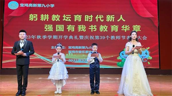9月8日上午,宝鸡高新第九小学举行2023年秋季学期开学典礼暨庆祝第39个教师节表彰大会。宝鸡市音乐家协会文艺“六进”志愿服务走进高新第九小学慰问演出,主会场设在厚德厅,通过直播的形式,全体师生及家长近2000人观看了本次活动。宝鸡市文联副主席、著名音乐家高德里、宝鸡高新区教育体育局副局长韩亚峰、千河镇党委副书记李林涛、宝鸡市音乐家协会主席左生明、宝鸡市音乐家协会表演艺术委员会主任连雪梅、宝鸡市音乐家协会秘书长薛峰堂、千河镇派出所、高新交警大队第二中队、千河镇卫生院、高新区部分兄弟学校代表、宝鸡市各新闻媒体等参加了此次大会。