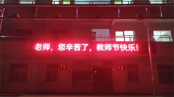二、营造浓厚节日氛围。9月10日19:00-21:30在学校门口led显示屏为教师“亮灯”,滚动字幕“热烈庆祝第39个教师节”“躬耕教坛,强国有我”“老师,您好!”“老师,您辛苦了!”“教师节快乐”等字幕,引导社会各界感念师恩、礼敬教师。