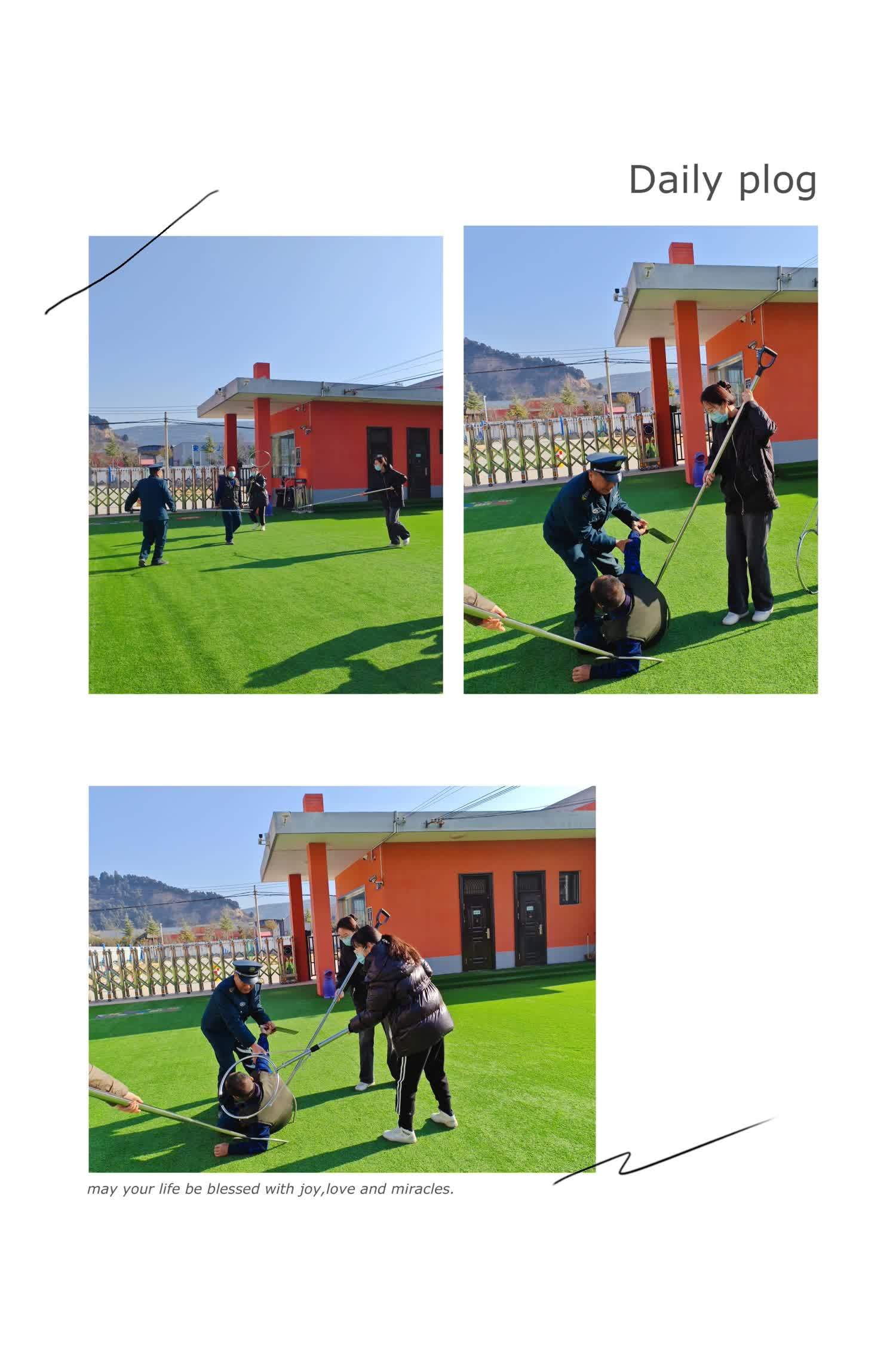 同时,幼儿园安保应急小组人员合力行动,手持防暴器材将“歹徒”制服,整个过程中大家临危不乱,与“歹徒”交涉、周旋,最终牵制“歹徒”,竭力保护全体师幼的安全,幼儿园宣布警报解除。