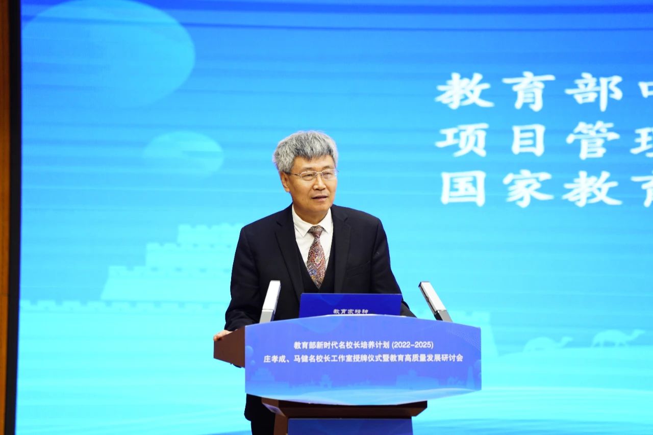 教育部中小学校长和幼儿园园长国家级培训项目管理办公室主任、国家教育行政学院教师工作与研究部主任于维涛宣读教育部办公厅《关于公布新时代中小学名师名校长培养计划(2022—2025)培养基地及培养对象名单的通知》。