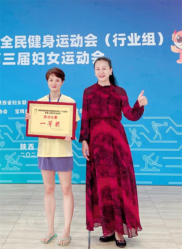 陈晶老师是在今年8月份举办的陕西省第四届全民健身运动会(行业组)暨第三届妇女运动会上,代表陕西省教育工委、省教育厅代表队参加了行业组的羽毛球和游泳2个项目的比赛,并获得了佳绩。其中分别荣获:“羽毛球比赛和游泳比赛”两个团体第一名。陈晶老师个人获得50米蛙泳第一名,50米自由泳第二名。