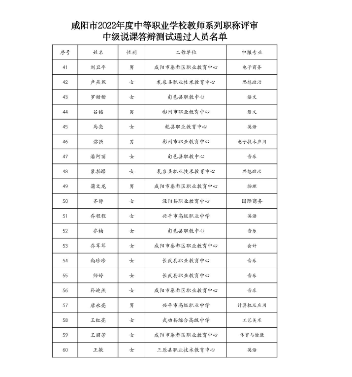 附件:咸阳市2022年度中等职业学校教师系列职称评审中级说课答辩测试通过人员名单