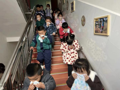 四、消防演练,防患未然。伴随着消防警报声响起,消防应急疏散演练拉开帷幕。孩子们在老师的引导下,捂住口鼻、低姿势弯腰,迅速按照预定路线到达指定的逃生安全区域,各班老师清点人数,确保每位幼儿安全撤离,整个演练过程做到了快速、安全、有序。