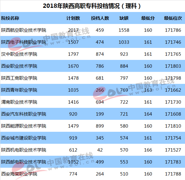 2018年陕西高职专科批次投档(理科),省内外573所高职院校共投放49511个招生计划,有72.6%的高职院校没有完成招生计划人数,省内院校缺额超过500人的达13所。